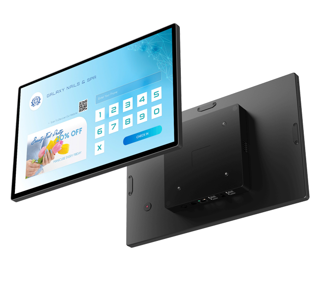 Our Front Desk Display and NFC card reader setup turns device into a beautiful client facing screen where clients can check in, leave infomation. Pay, view their total, select a tip, add a signature, and choose how to get their receipt.
